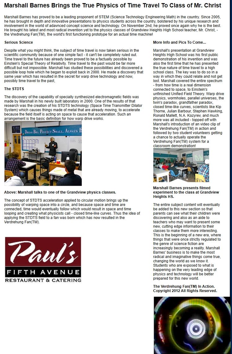 Grandview Heights High School physics students saw a demonstration last week of a device its inventor believes could be the first step toward creating a time machine.Marshall Barnes, a research and development engineer who splits his time between Columbus and Yellow Springs, completed work in August on the device he calls a Verdrehung Fan.His appearance Friday, Nov. 2, at the high school was the first hands-on demonstration of his invention.Grandview High School is special to him, Barnes said, because he developed much of the technology he uses in his device at a lab he operated in the early 2000s on Dublin Road. He has made previous visits to the high school's science classes.
